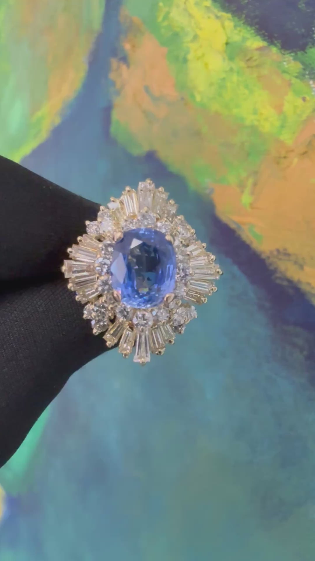 Surrounding the sapphire are natural round brilliant diamonds totaling approximately 1.00 carat, graded G–I in color with VS–SI clarity, along with 20 baguette diamonds weighing about 1.00 carat, showing an I color grade. The ring is crafted in the classic ballerina style and weighs 9.6 grams. It is currently a size 4.5.