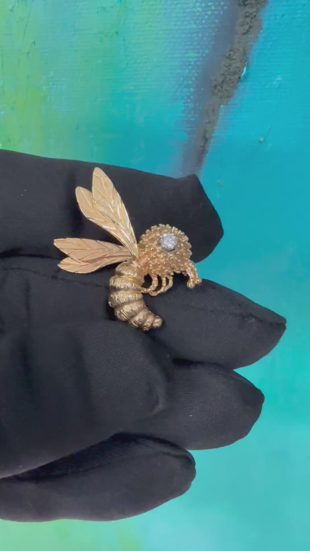 Retro Yellow Gold 0.13 Carat Natural Diamond Bee Brooch Pin Circa 1985