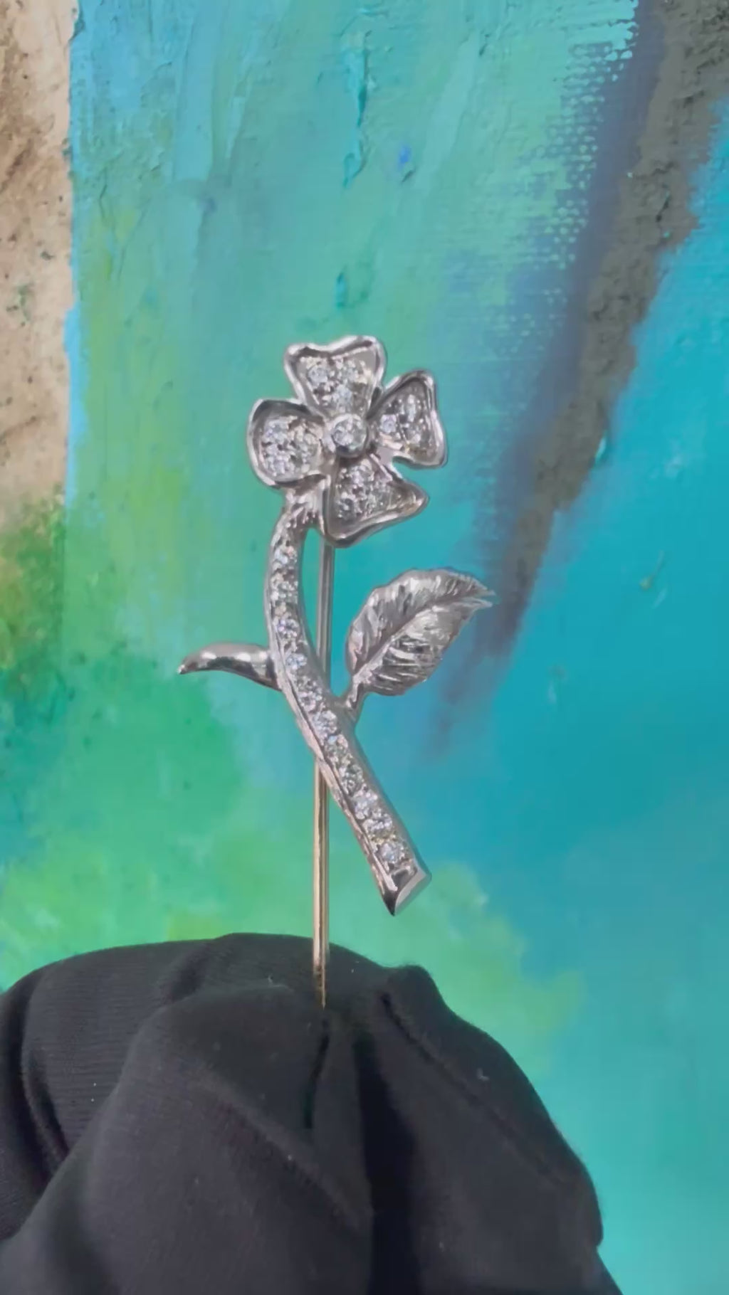 Retro 18K white gold flower pin circa 1965, set with 24 natural round brilliant diamonds totaling approximately 0.40 carat. The finely detailed floral form measures about 34 mm × 19 mm and weighs 4.4 grams in total. Beautifully crafted with classic mid-century elegance.