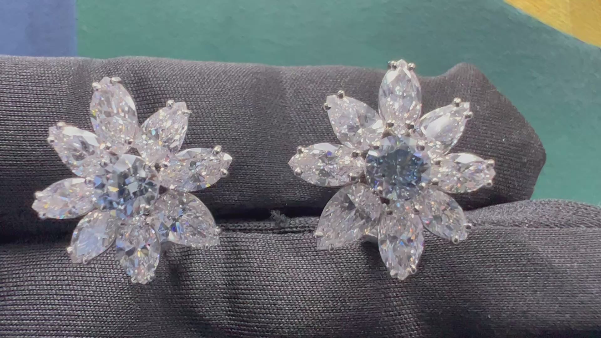 The 18k White Gold earrings include 16 pear and marquise shaped natural diamonds weighing 6.51 carats total, all GIA certified as "D" in color, vs2 or better in clarity, and no fluorescence.