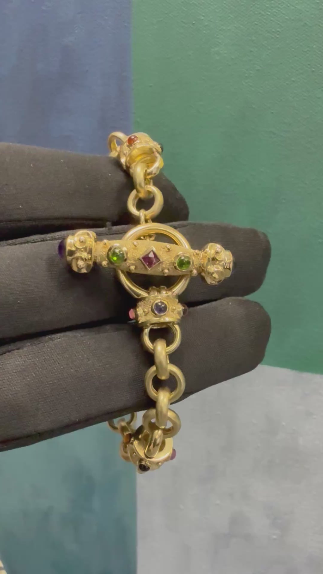 This exquisite bracelet is crafted in rich 14K yellow gold and showcases a vibrant array of cabochon-cut gemstones, including amethyst, sapphire, and tourmaline. The design features a unique toggle-style clasp, adding a touch of playful elegance to the piece. Weighing approximately 42 grams and measuring about 7¼ inches in length, it offers both substance and sophistication. Stamped ADK, this bracelet is a beautiful statement of color and craftsmanship.