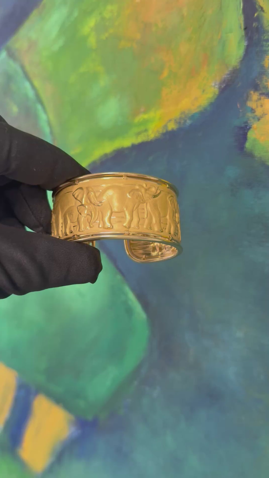 Retro Gold Signed Carrera y Carrera Repousse Cuff Bangle with central matte gold panel depicting a family of Elephants. The piece is stamped with the serial number, logo and "750" yellow gold.