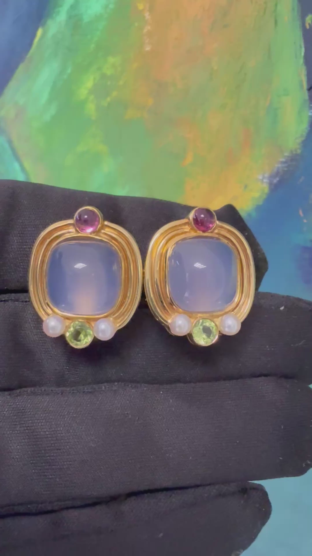 Retro Gold Cabochon Earrings with Chalcedony, Tourmaline & Peridot