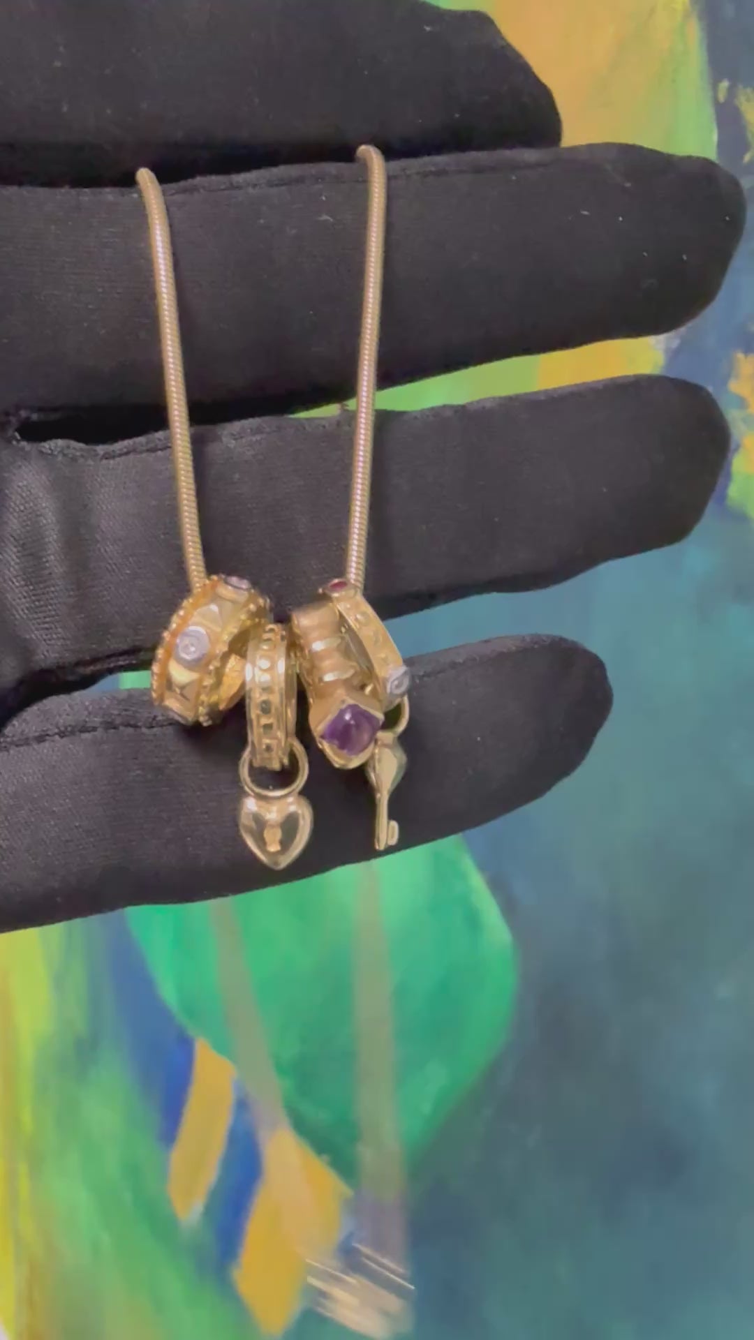 Retro 14K yellow gold chain measuring 16 inches in length and 1.7 mm in thickness, adorned with four designer charms — a diamond charm, an amethyst charm, a ruby charm, and a key-and-heart motif charm. Each charm measures approximately 13 mm in diameter. The piece weighs a total of 16.5 g. A charming and versatile retro design that blends colorful gemstones with timeless gold craftsmanship.