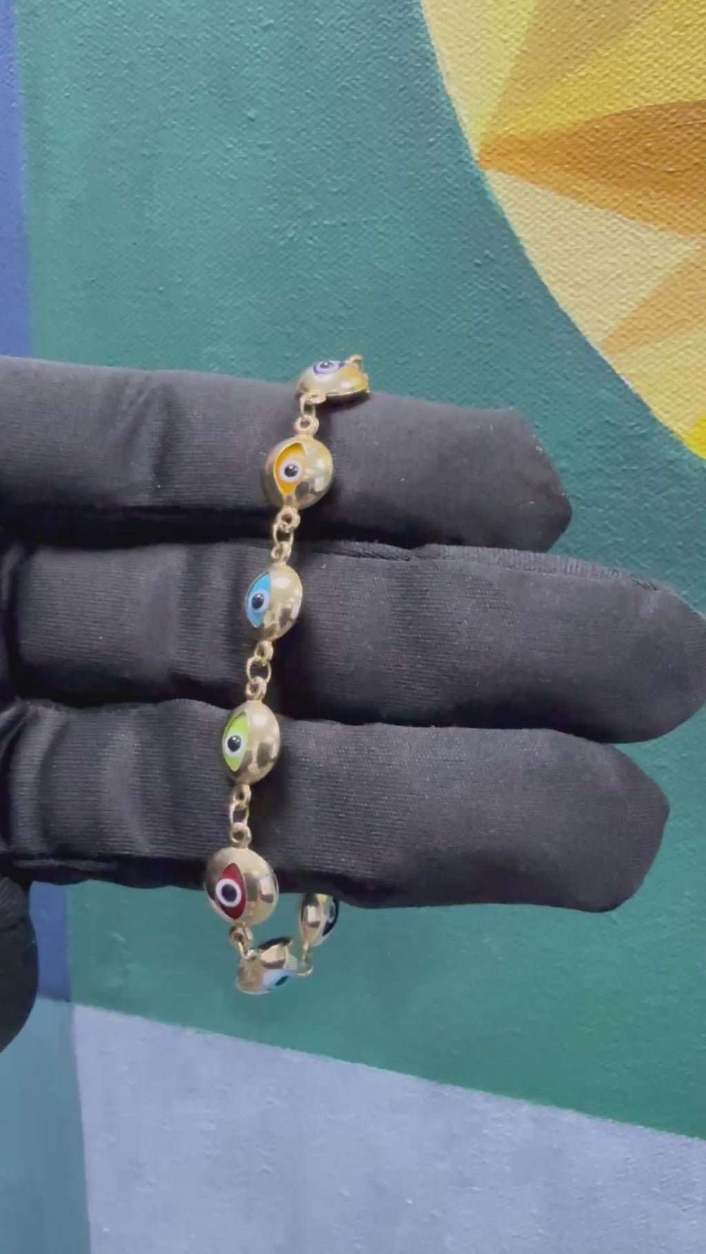 A modern 14K yellow gold bracelet features the iconic lucky eye, a symbol cherished across cultures for warding off negative energy and attracting good fortune. Richly accented with a spectrum of vibrant multicolor details. Measuring 6.75 inches in length and weighing approximately 7.3 grams, it is a delicate yet powerful statement—perfect for layering or wearing on its own as a signature piece.