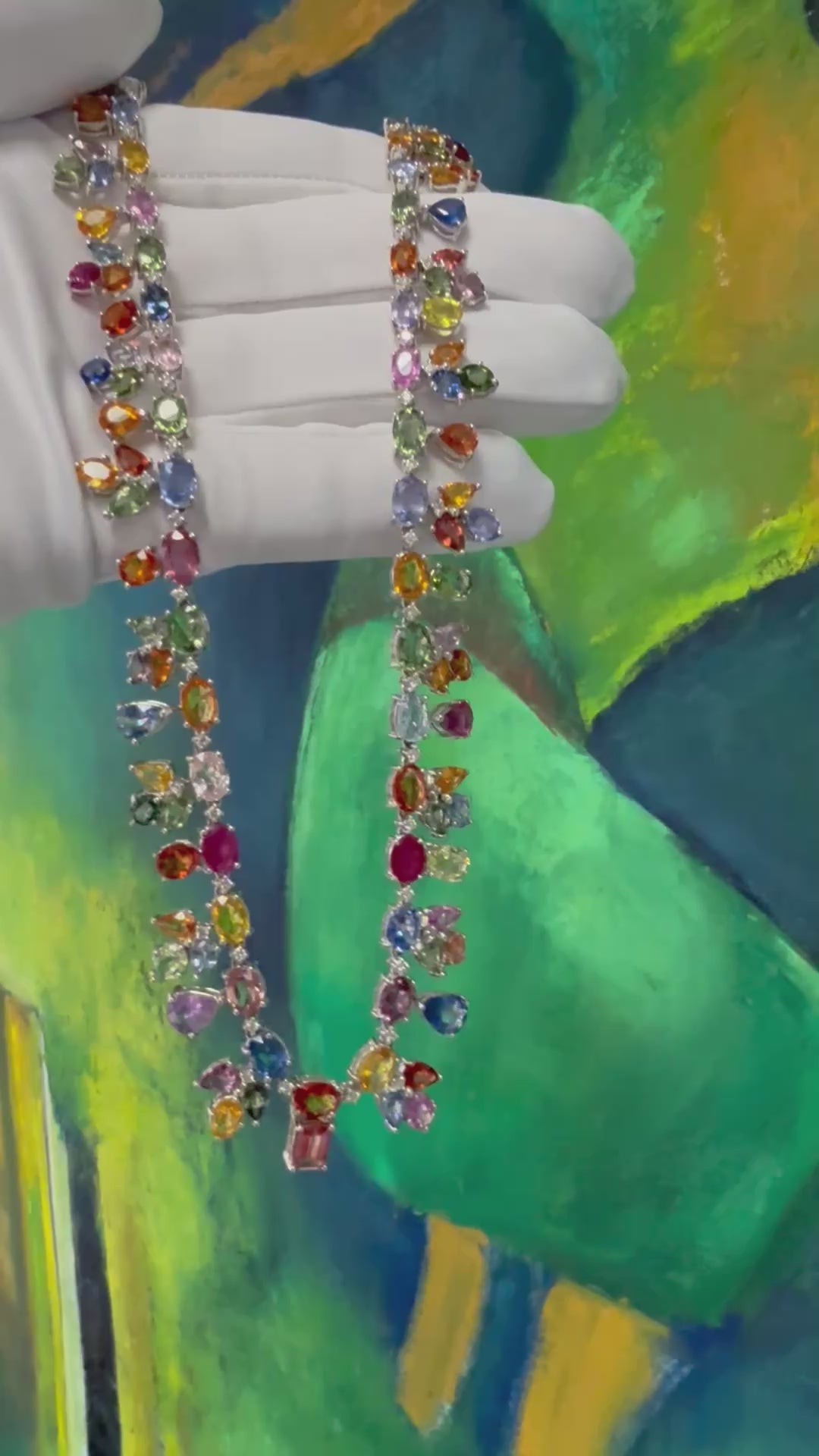 The necklace is set with 132 natural multicolor gemstones and sapphires, complemented by approximately 66 natural round brilliant colorless diamonds, for approximately 198 stones in total.