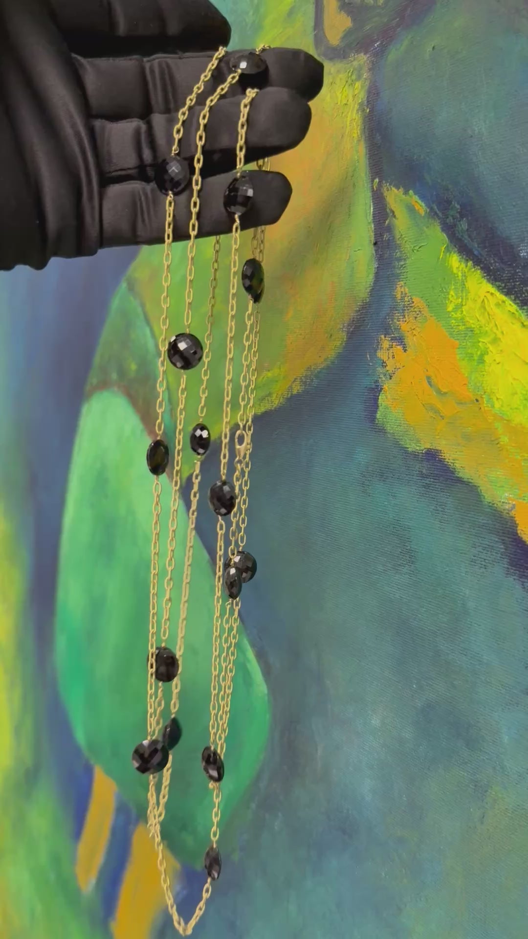 Retro 18K yellow gold opera-length necklace measuring approximately 66 inches in length, composed of fine 2 mm link chains and set with 17 natural rose-cut garnets, each about 12 mm in diameter. The necklace weighs 49.5 g total and can be worn as a single long strand, or doubled or tripled for a layered look, with the top layer forming a choker style. Crafted in Italy with exceptional attention to detail, this versatile design displays exquisite retro craftsmanship and timeless elegance.