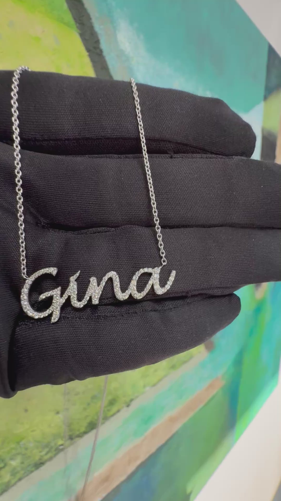 Modern 14K white gold natural diamond necklace spelling “GINA”, set with approximately 79 natural round brilliant colorless diamonds totaling approximately 0.50 CARATS. The diamonds are approximately H–I in color and SI1 to VS1 in clarity.