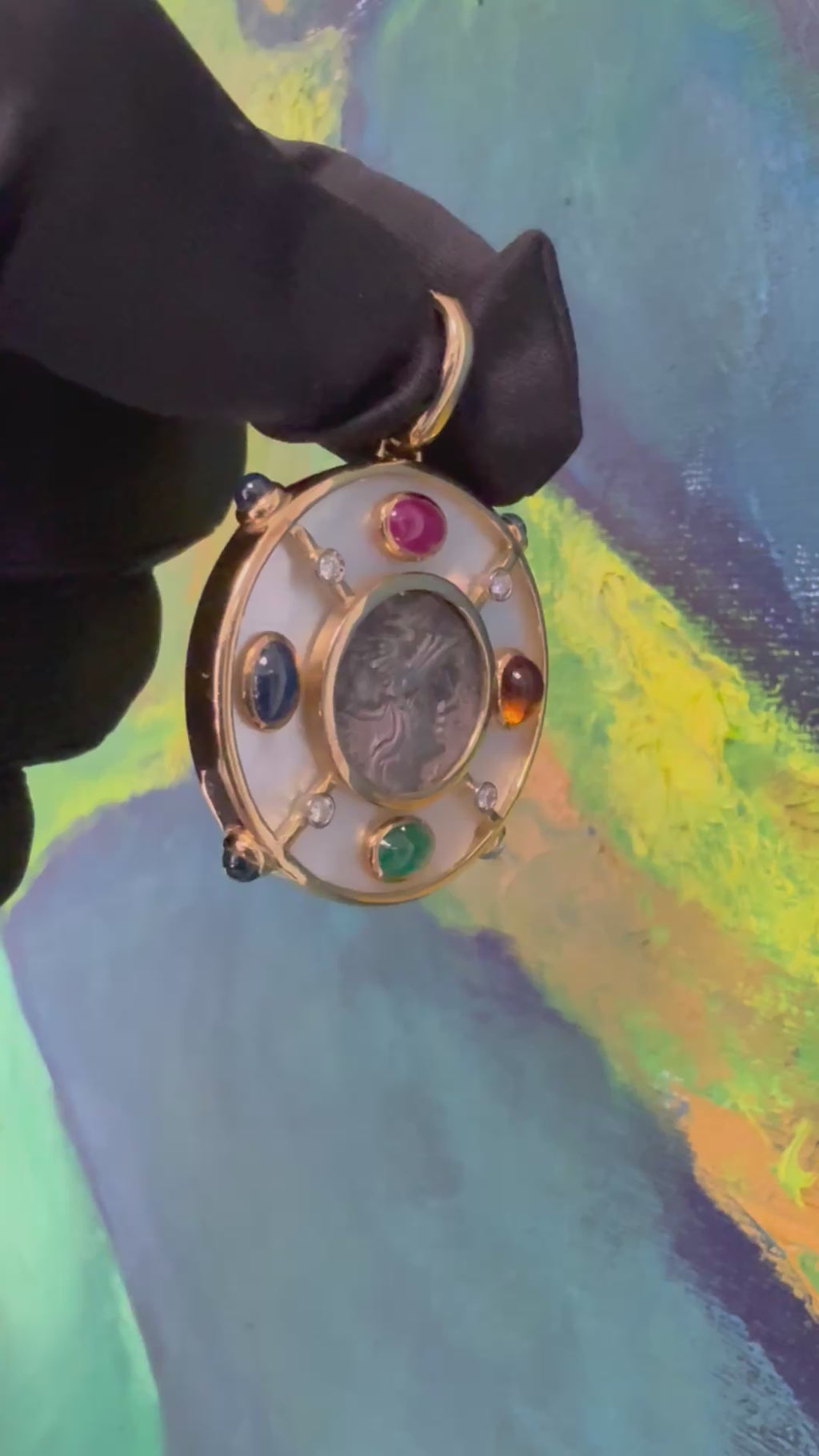 Retro Italian pendant crafted in 18K yellow gold, centering an authentic ancient Roman bronze sestertius coin from the reign of Emperor Antoninus Pius (138–161 AD). The coin is framed in a bold gold bezel and further enhanced with an array of fine gemstones for a multicolor effect.