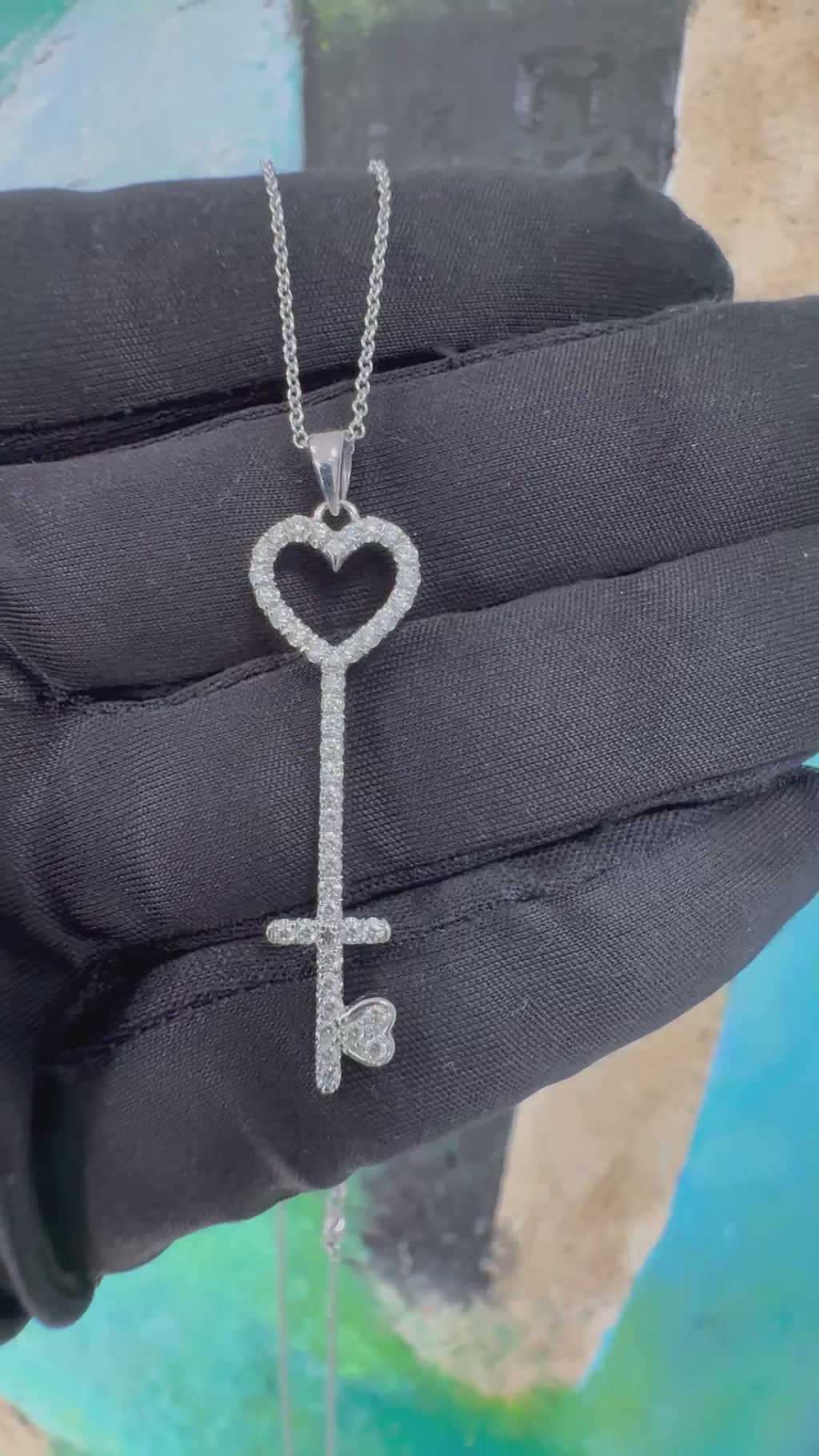 Modern 14K white gold natural diamond key pendant necklace set with 42 colorless round brilliant diamonds totaling approximately 0.75 CARAT. The key-shaped pendant measures approximately 38 mm in length and 12 mm at its widest point, and the pendant alone weighs 2.1 g. With the 18-inch white gold chain, the total weight is 3.9 g. A refined piece with elegant lines and a bright, timeless appeal.