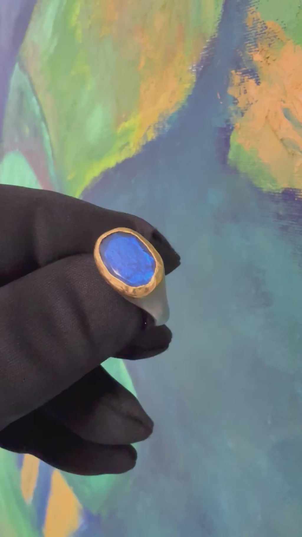 Its most striking quality is its labradorescence — a unique, iridescent play of colors like blue, green, and purple that flashes beneath the surface of the stone, giving the ring a captivating and timeless appeal.