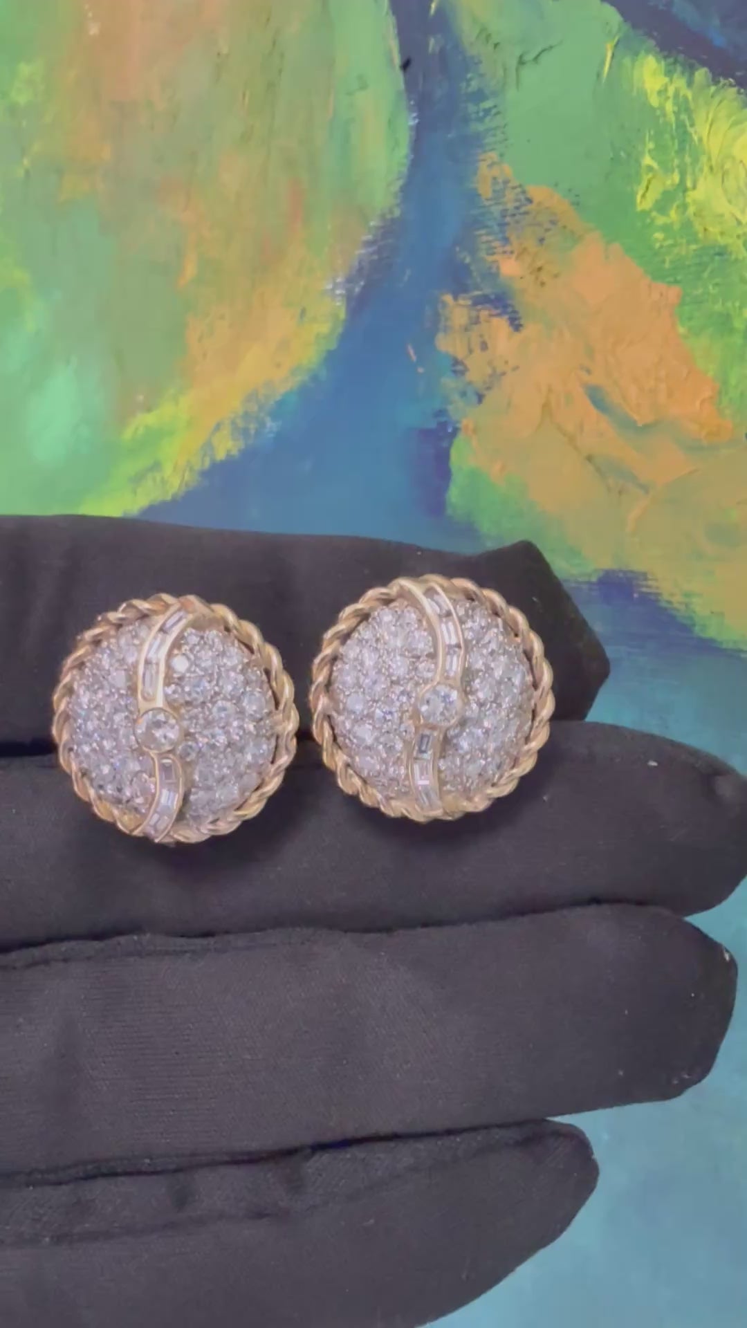 A striking retro pair of earrings crafted in two-tone 14K white and yellow gold, set with approximately 3.00 carats of natural diamonds. The design features 90 round and 12 baguette colorless diamonds, offering a bright and timeless appeal. The earrings measure 21 mm in diameter and weigh 10.8 grams.