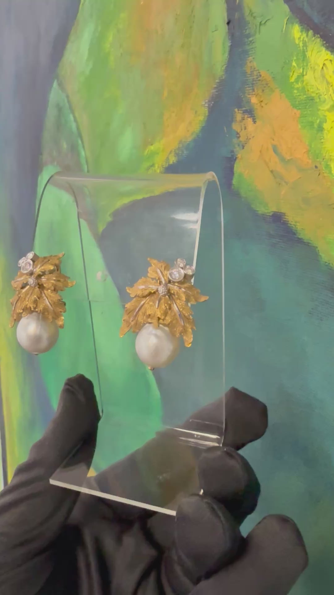 Stunning retro natural diamond and pearl earrings, crafted in both yellow and white gold. The vintage leaf motif showcases rare handwork that is nearly impossible to replicate today.