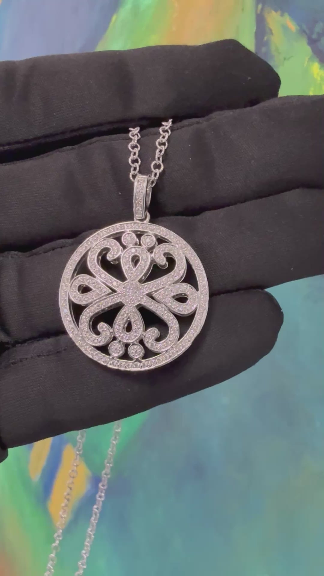 A striking 14K white gold medallion pendant, finely crafted and set with approximately 140 natural round brilliant diamonds. The diamonds total about 1.00 carat in weight and are graded in the near-colorless range of G–H with VS to SI clarity, offering a bright and timeless appeal. The pendant measures 28 mm in diameter and 5 mm in thickness, with a total weight of 11.8 grams (without the chain). Chain is not included.