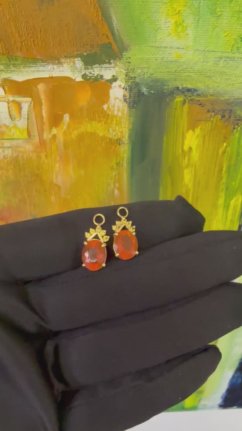 A pair of yellow gold earring enhancers featuring two stunning oval-shaped natural Mexican opals in vibrant orange, each measuring approximately 11 mm by 9 mm. Accented with five yellow gemstones, these enhancers measure a total of 21 mm in length and weigh 3.7 grams, combining bright color and elegant design.