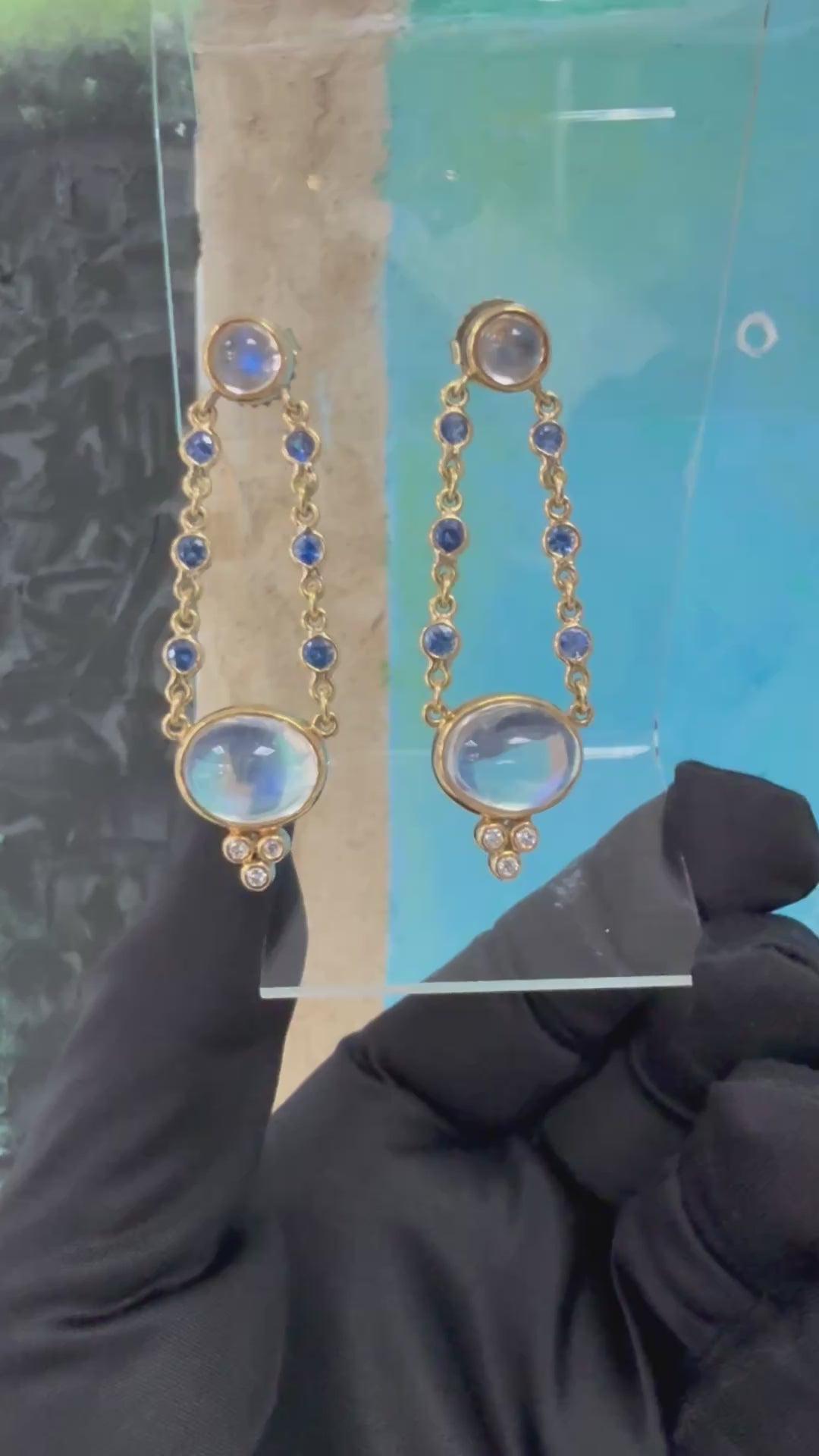 A striking pair of retro drop earrings crafted in 18K yellow gold, circa 1980. Each earring features a luminous cabochon moonstone, showcased within an oval gold frame measuring approximately 9.5 × 8 × 5 mm, complemented by a round moonstone top of 6.2 mm. Accents of vivid natural tanzanite rounds, each measuring 3 mm, add a touch of vibrant contrast, while natural diamonds provide an elegant finish.
