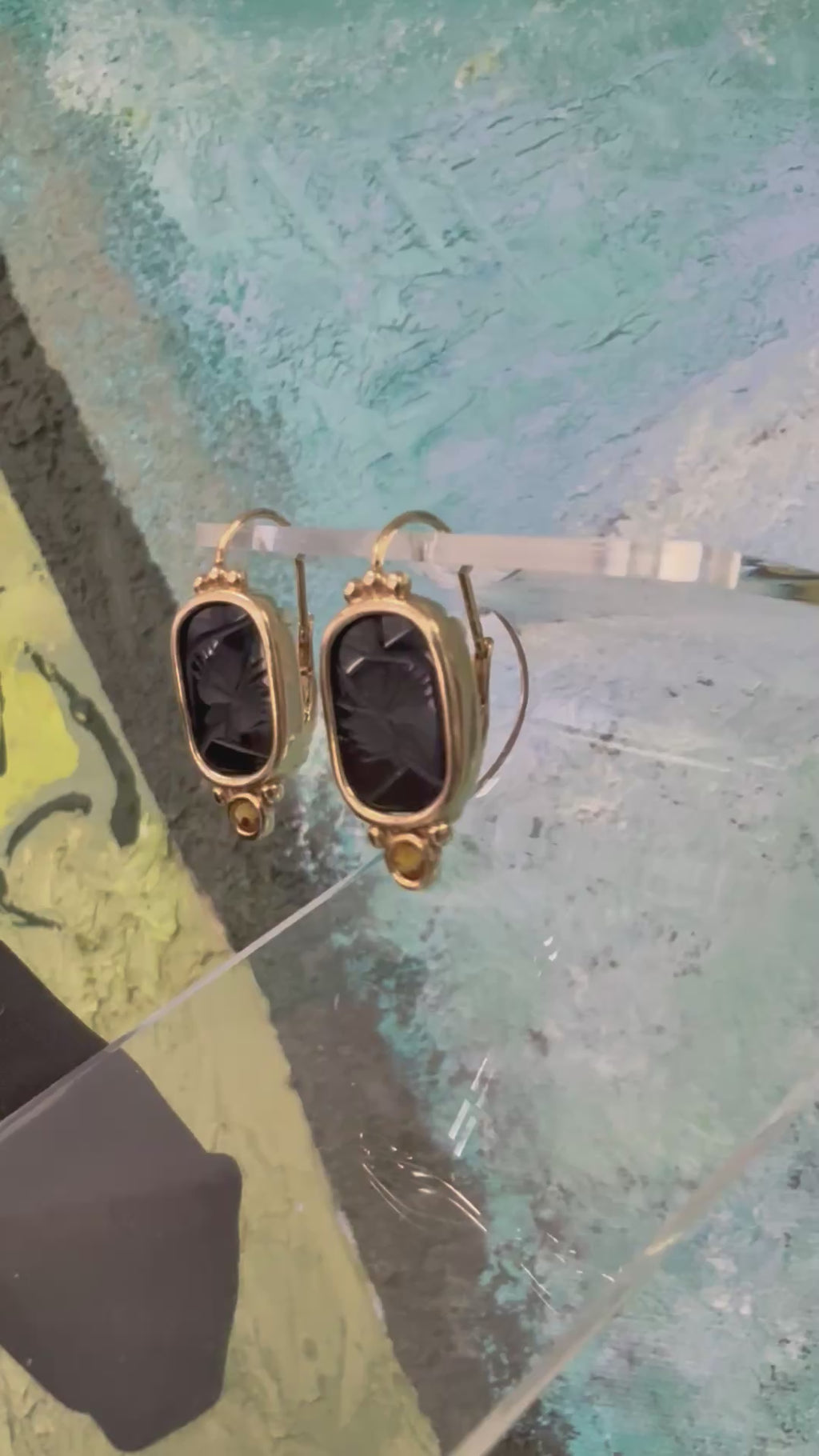 Retro Gold Roman Black Onyx Intaglio Earrings with Citrine 1985