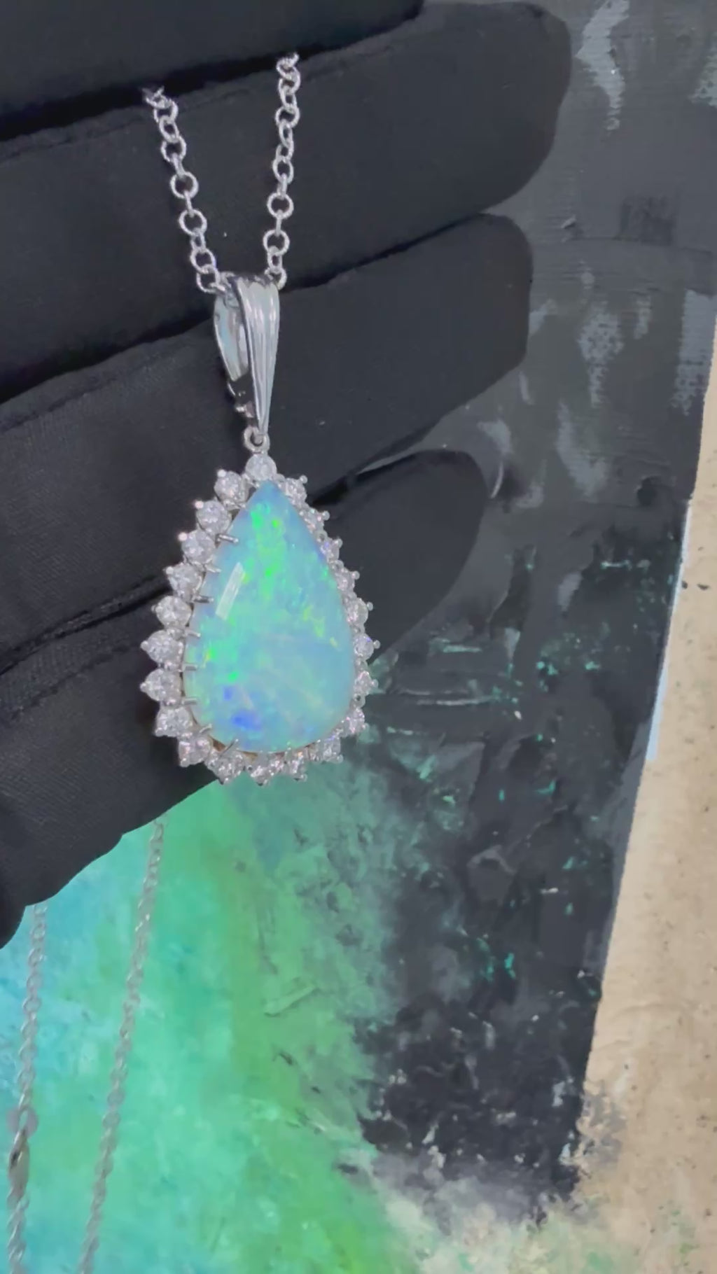 Retro 14K white gold pendant featuring a magnificent natural Australian pear-shaped opal weighing approximately 6.5 carats and measuring about 23 × 16 × 4 mm. The opal is framed by 22 natural round brilliant diamonds with a combined weight of approximately 1.50 carats, graded colorless with VS–SI clarity. The pendant weighs 7.3 grams (without chain). Chain not included.
