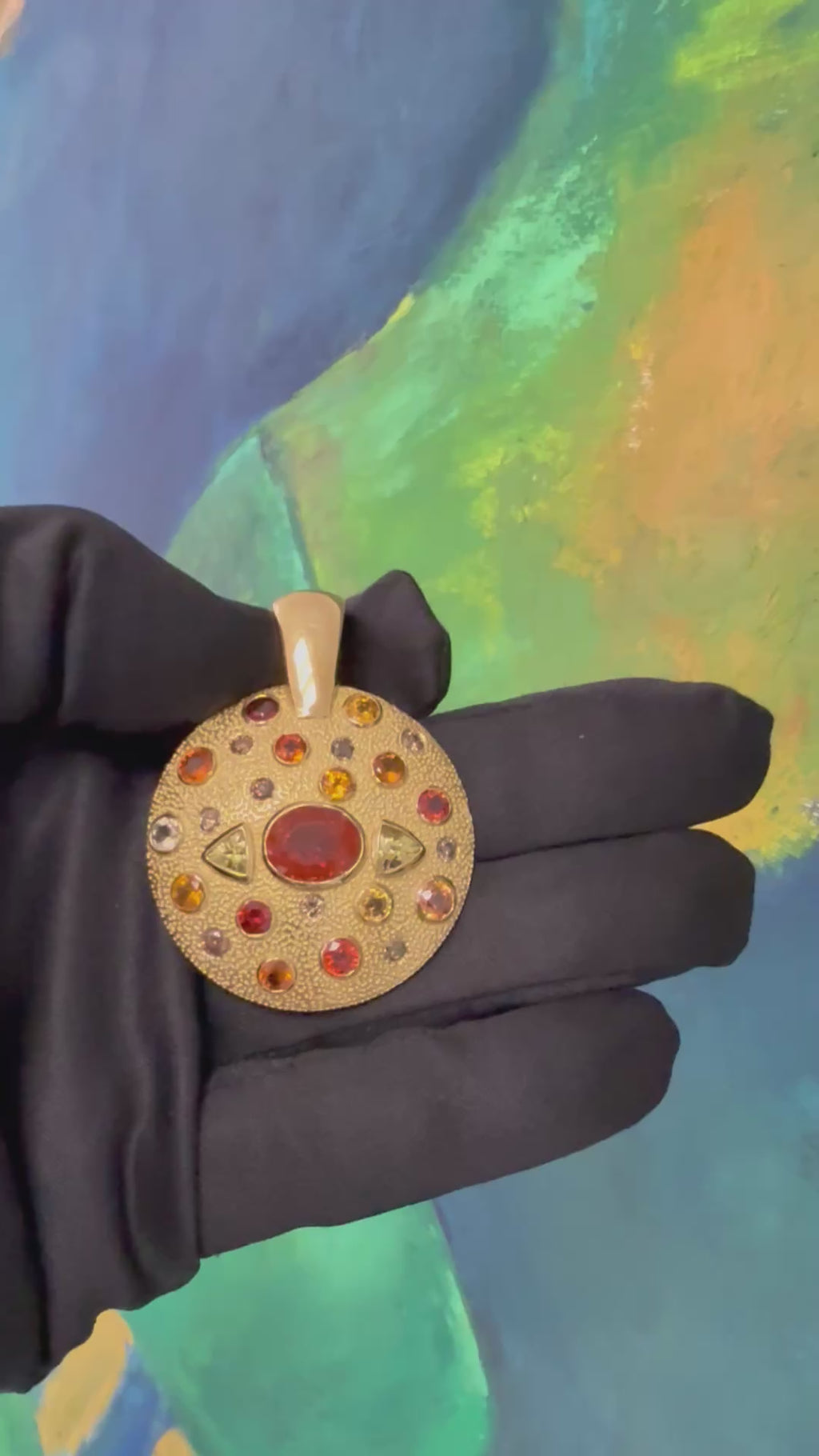 Retro 18K yellow gold medallion pendant featuring a bold array of multicolor gemstones. At the center rests a spectacular oval Mexican opal, measuring approximately 11 × 8.5 mm, glowing with its signature fiery orange tone. Surrounding the opal are natural diamonds, tourmalines, and garnets, each individually bezel set to create a seamless and elegant design.
