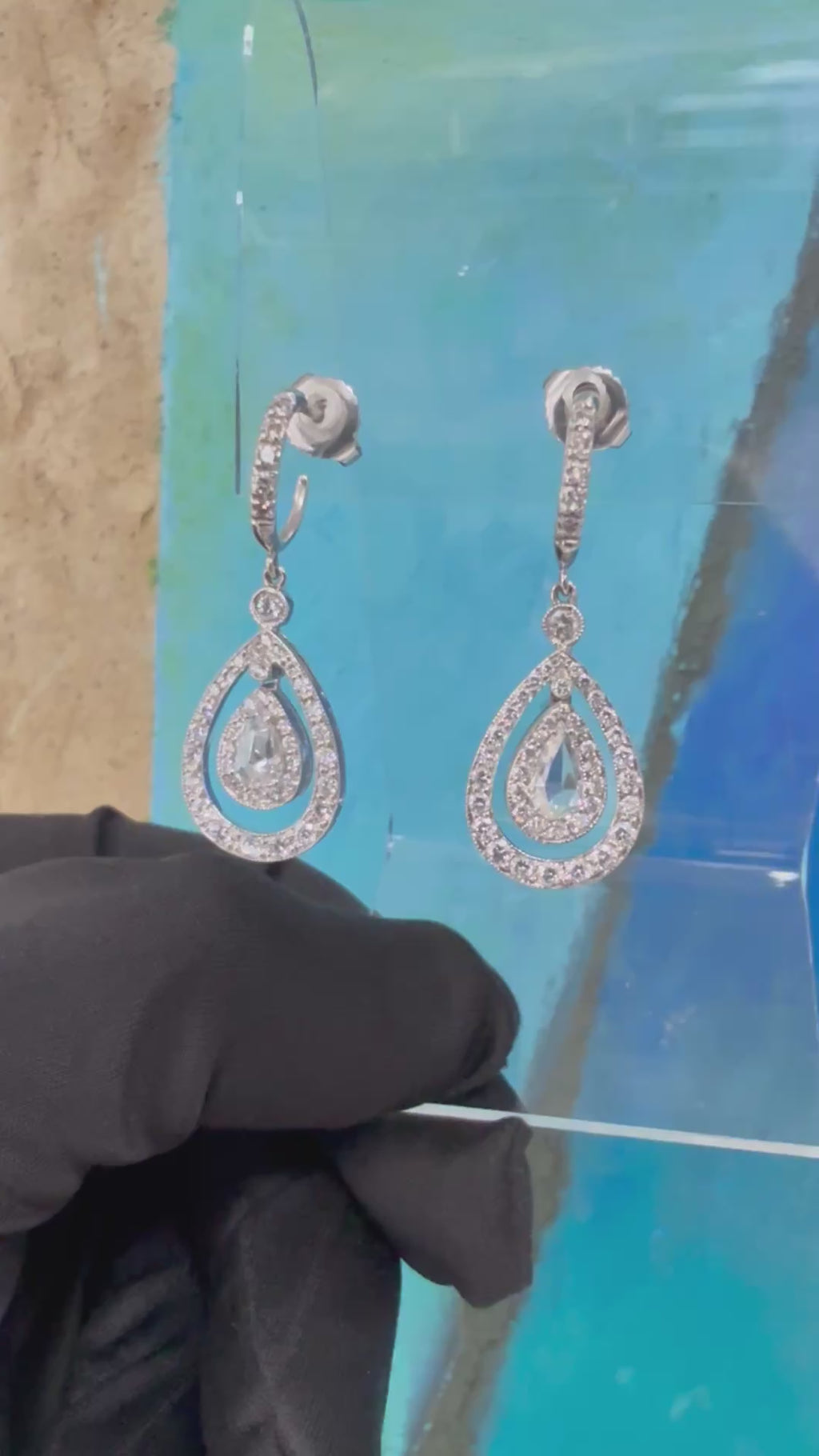 An elegant pair of drop earrings crafted in 14K white gold, stamped 585, with a refined balance of form and brilliance. The earrings measure approximately 1.25 inches in length and taper to a half inch width at the base, weighing a total of 4.5 grams. At the center of each drop rests a pear-shaped rose-cut diamond, each measuring about 6 × 3.5 × 1.5 mm, highlighted by a surround of approximately 96 round diamonds that graduate in size.