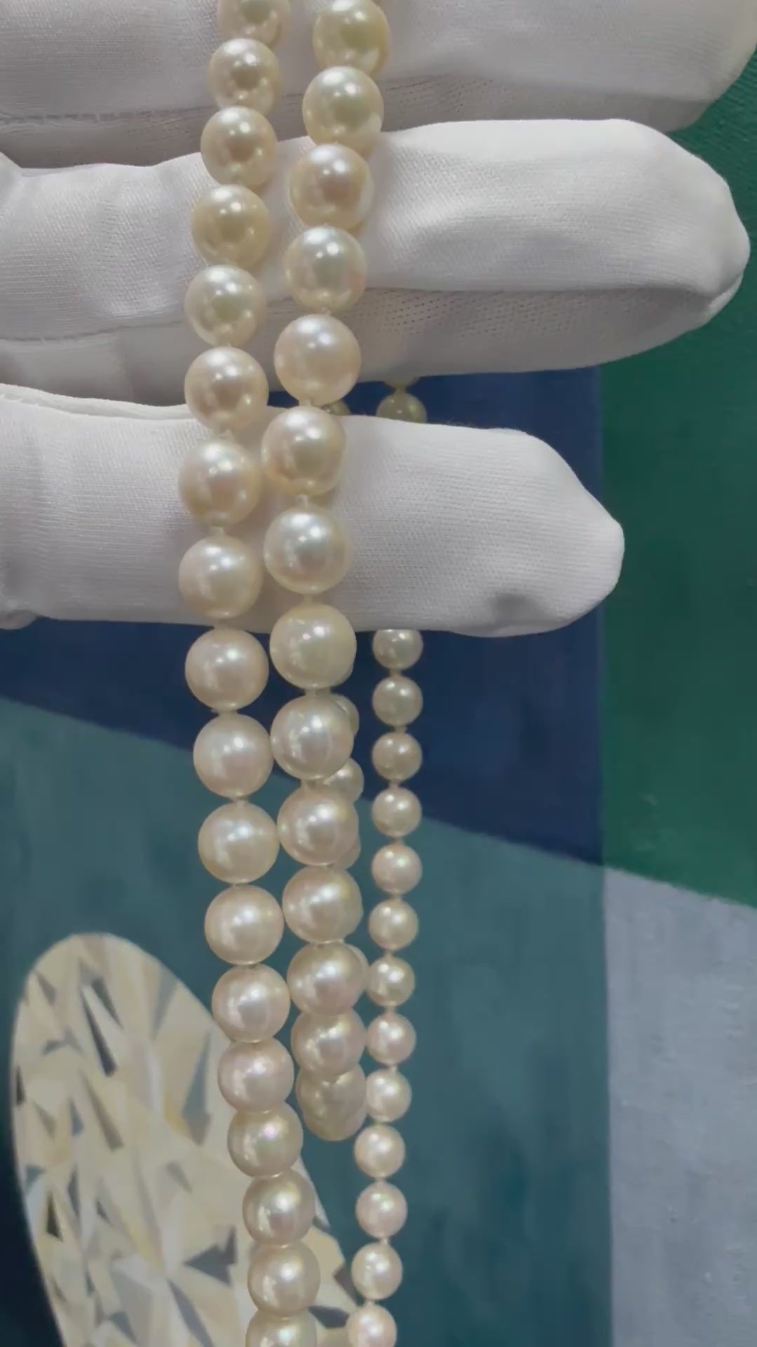 Retro South Sea high-luster pearl strand measuring 31 inches in length, composed of 99 pearls averaging approximately 7.25 mm in diameter. The necklace can be worn as one long opera-length strand or doubled for a small choker style. The pearls display very good surface quality with minor natural blemishes and a stunning overall luster, showcasing elegant refinement and timeless sophistication. 52 grams.