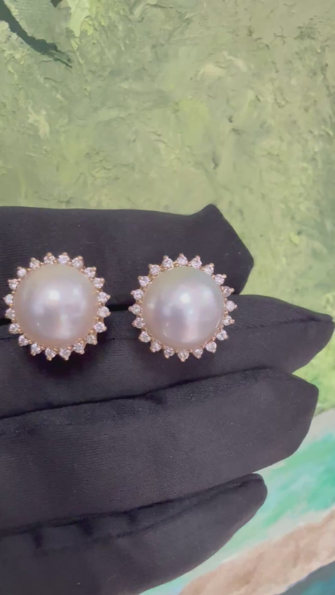 Elegant retro 14K yellow gold earrings each centered with a 14 mm Mabe pearl of high luster, framed by 40 natural round brilliant diamonds of H color and VS–SI clarity, weighing approximately 1.20 carats total.
