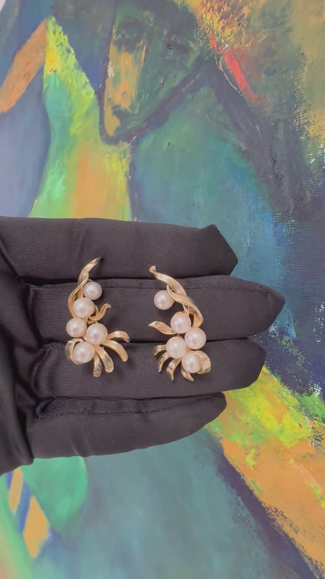 Stylish retro yellow gold clip earrings set with 10 cultured pearls, each measuring approximately 7 mm in diameter. The earrings measure approximately 38 mm in length and 18 mm in width, with a total weight of 12 grams.