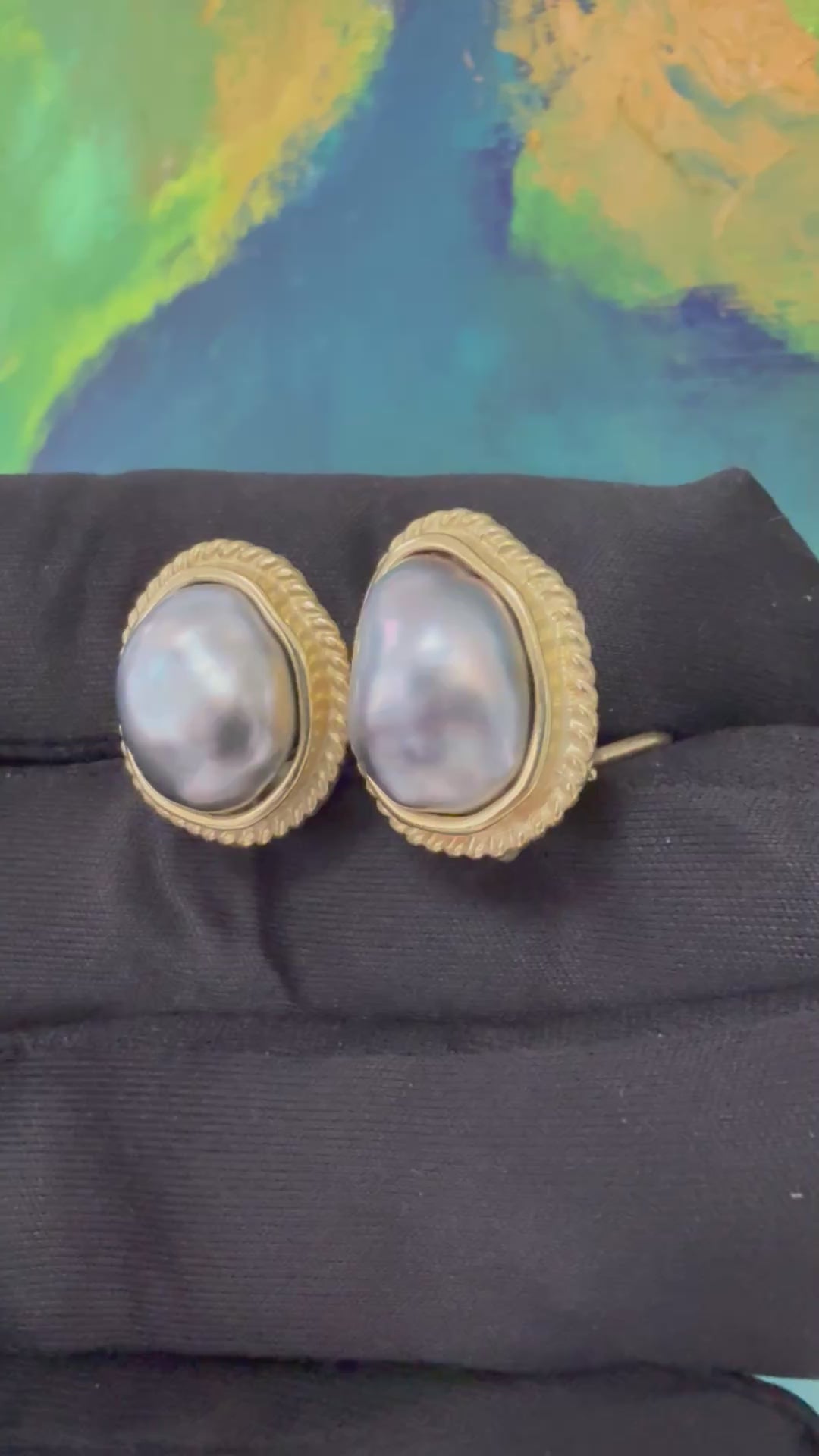 Retro Yellow Gold Black Tahitian Baroque Pearl Earrings Circa 1995