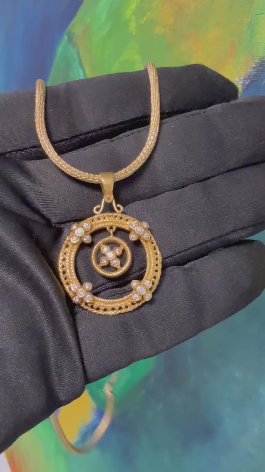 Retro 22K yellow gold pendant set with 25 natural round brilliant diamonds totaling approximately 0.45 carats. The pendant measures about 1 inch in diameter and weighs 9.5 g. It is paired with a 14K yellow gold chain measuring 16 inches in length, 1.9 mm in thickness, and weighing 7.9 g. Total combined weight is 17.4 g.