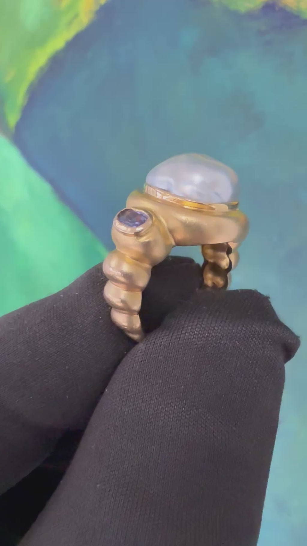 Retro gold statement ring circa 2000, featuring a baroque gray high luster pearl accented with natural amethyst and peridot gemstones. The top portion measures approximately 16.8 mm in width, with a band that tapers from 8 mm down to 3 mm. The ring is a size 5.5 and weighs approximately 6.5 grams in total. Finely crafted with bold artistic detail.
