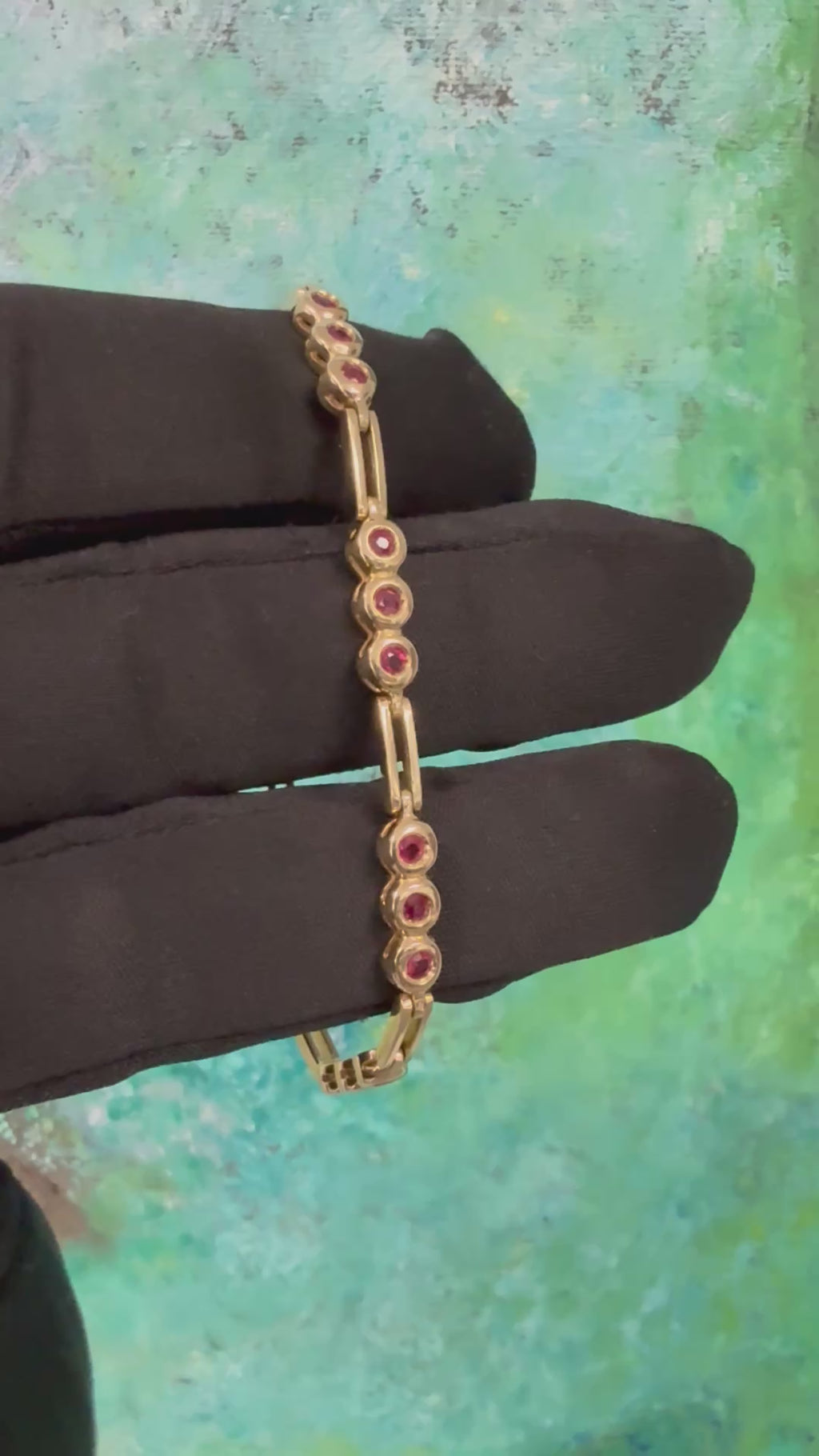 Retro 14K yellow gold bracelet set with 21 natural red rubies, weighing approximately 0.65 carats in total. The bracelet measures 7 inches in length and weighs 13.5 g.