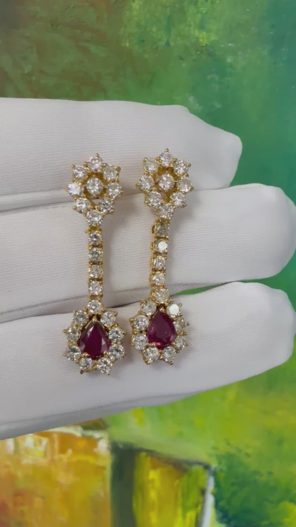 Retro yellow gold drop earrings, circa 1975, set with two natural pear-shaped Thai rubies weighing approximately 1.50 carats total and measuring about 6.5 × 5 × 2.7 mm each. Surrounding the rubies are 44 natural round brilliant diamonds weighing approximately 3.00 carats total, graded H in color and VS–SI in clarity. The earrings measure about 1.5 inches in length, with the bottom drop portion measuring 0.5 inch in width. The total weight of the pair is 9.4 grams.