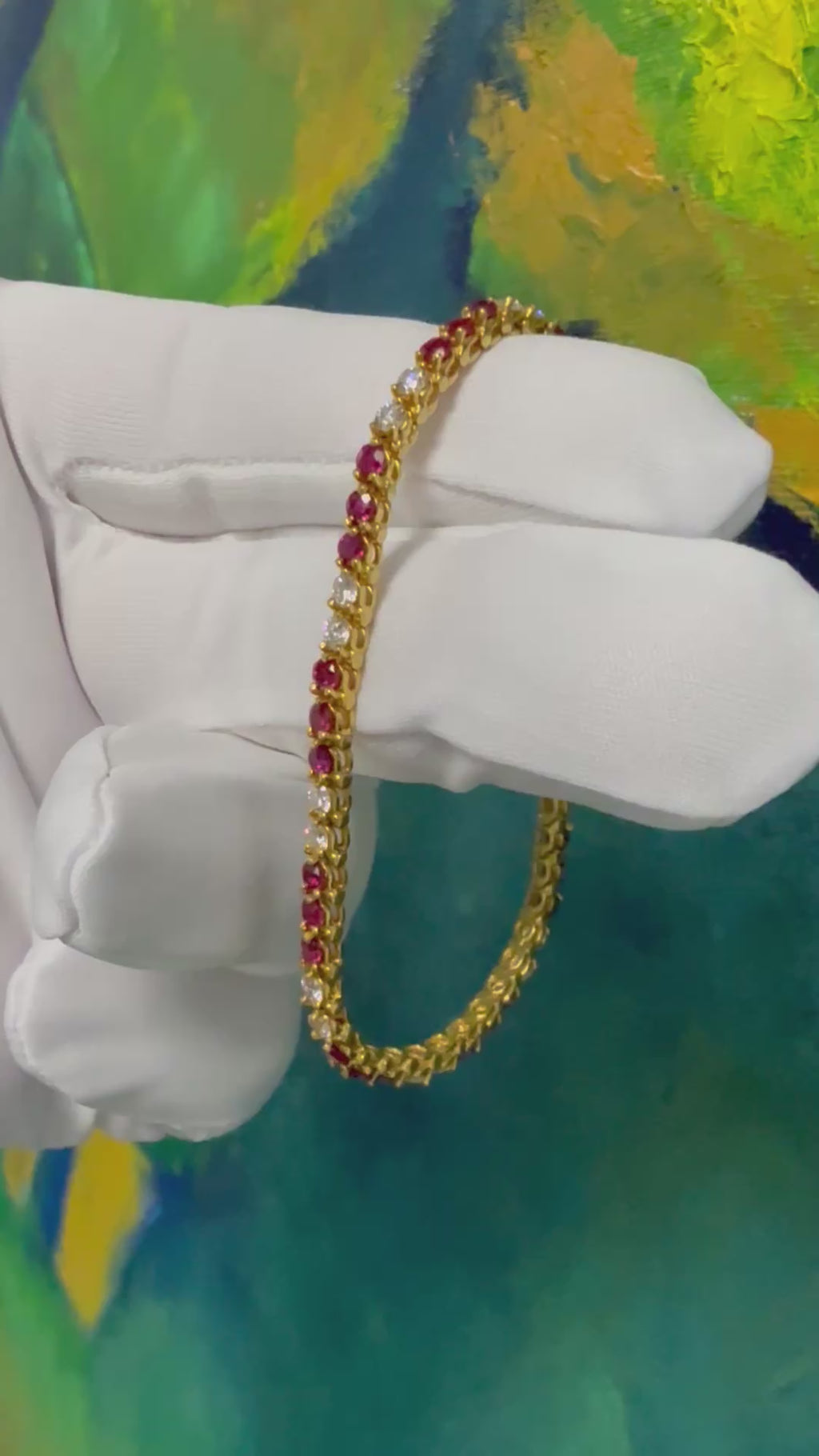 Stunning 18K yellow gold tennis bracelet stamped and set with approximately 4.5 carats total of natural gemstones. The bracelet features 20 natural round brilliant diamonds graded F in color and VS in clarity, and 30 natural round red rubies, totaling 50 stones. Measuring 6.75 inches in length and weighing approximately 11.3 grams, this bracelet displays elegant craftsmanship and a timeless design.