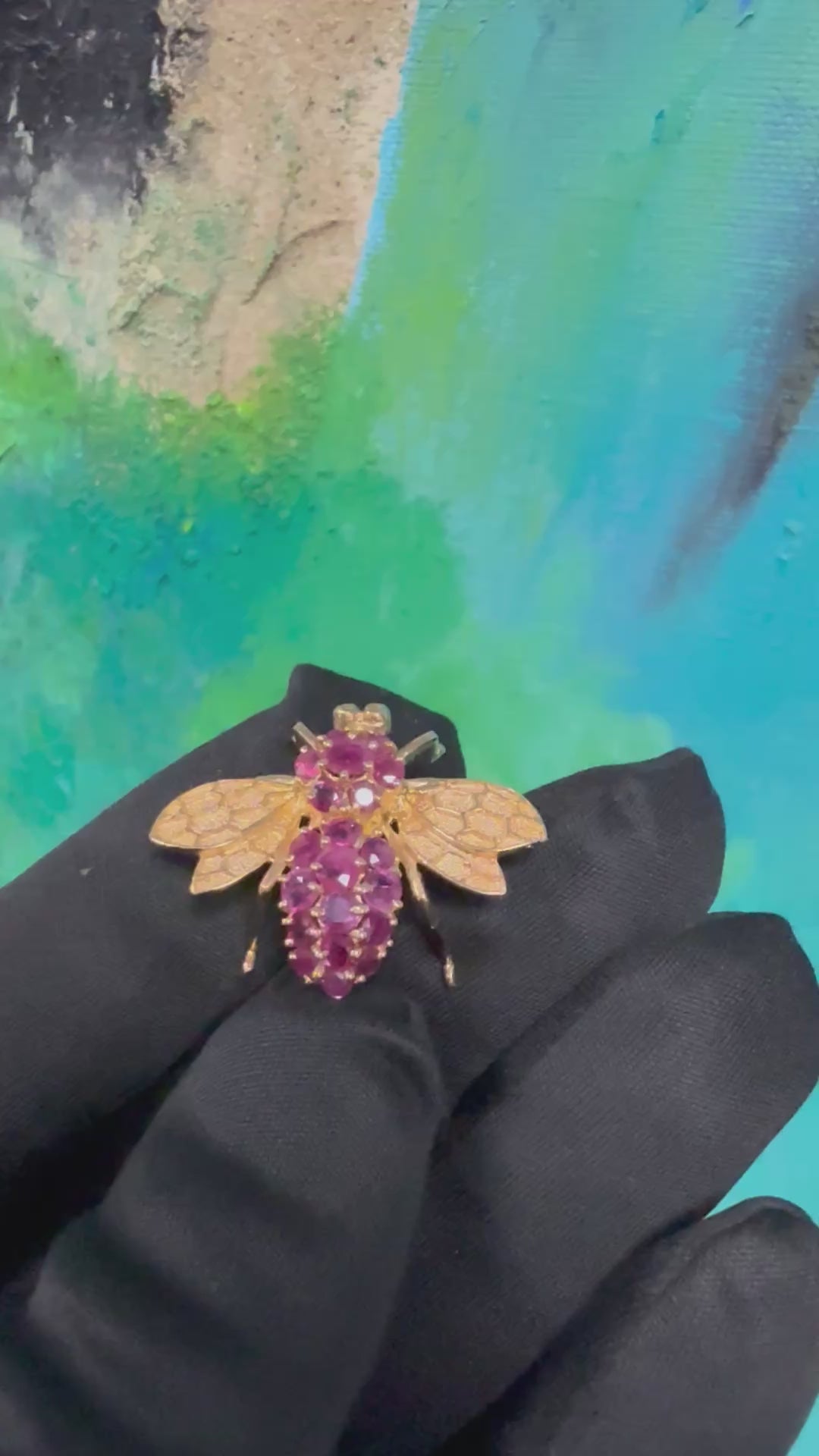 Retro 14K yellow gold bee-shaped brooch set with approximately 2.5 carats of natural round rubies. The piece is finely detailed, measuring about 1 inch in length and 1.25 inches in width, and weighs 6 g total. Stamped 14K, this circa 1985 design captures the playful elegance and craftsmanship of the retro era — a charming collectible symbol of beauty and vitality.