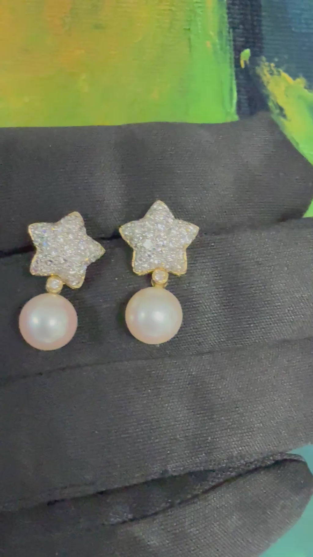 Modern Gold 1.5 Carat Natural Diamond and South Sea Pearl Star Earrings