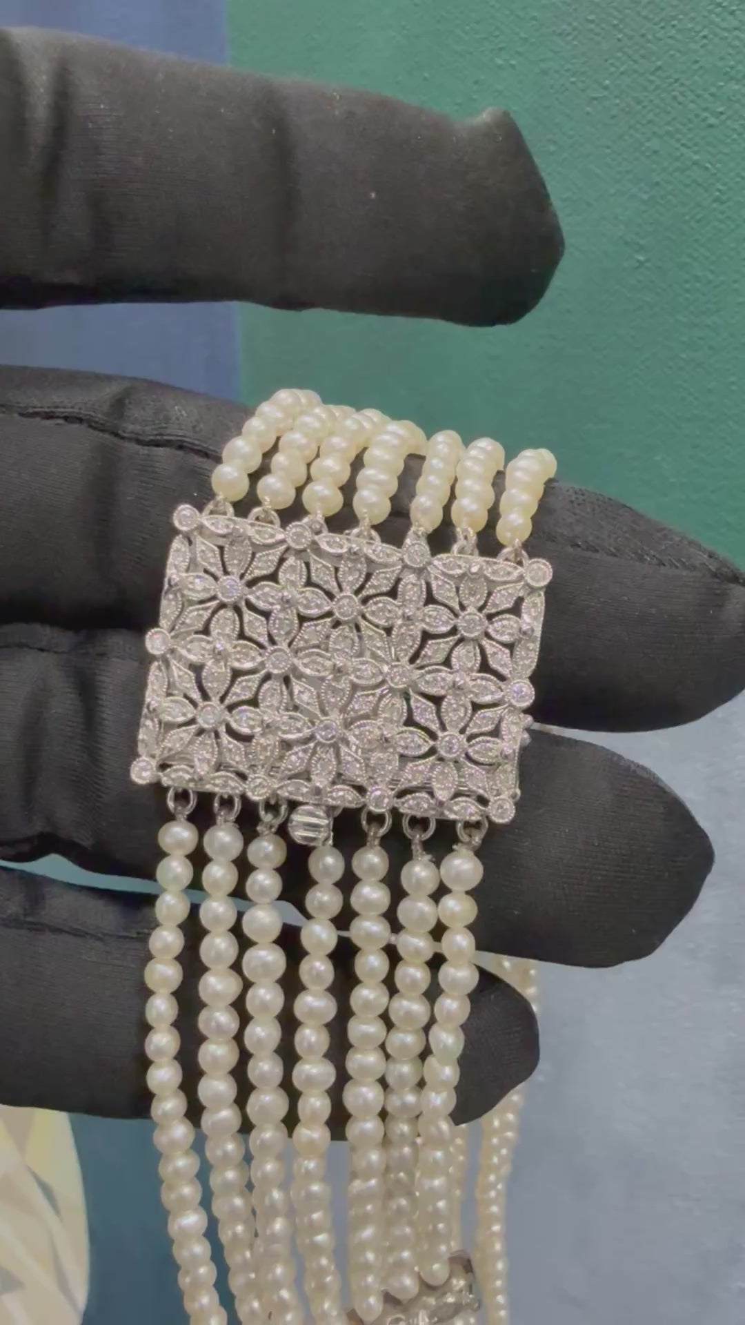 Striking retro 18 karat white gold seven-strand pearl choker necklace, measuring approximately 14 inches from the shortest point. Each delicate pearl measures about 3 mm in diameter, and the piece weighs approximately 48 grams in total.