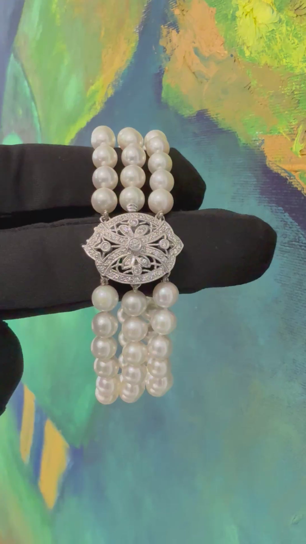 A magnificent three-strand cultured Akoya pearl bracelet, circa 1980. The piece features sixty-six pearls measuring approximately 6.5 mm in diameter, each displaying excellent luster and orient with only minor surface characteristics that do not detract from the bracelet’s beauty.