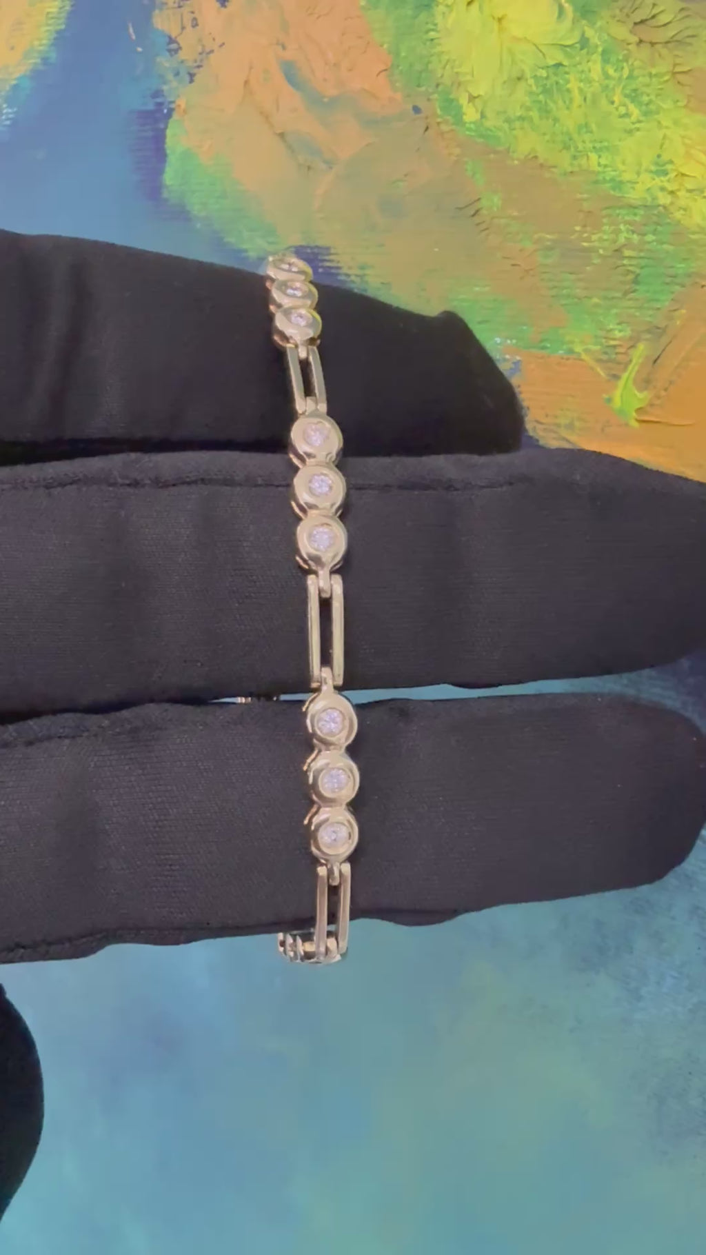 Retro 14K yellow gold bracelet stamped 14K, set with 21 natural round brilliant cut diamonds totaling approximately 0.65 carats. The diamonds are graded colorless, with clarity ranging from VS to SI2. The bracelet measures 7 inches in length and dates circa 1980.